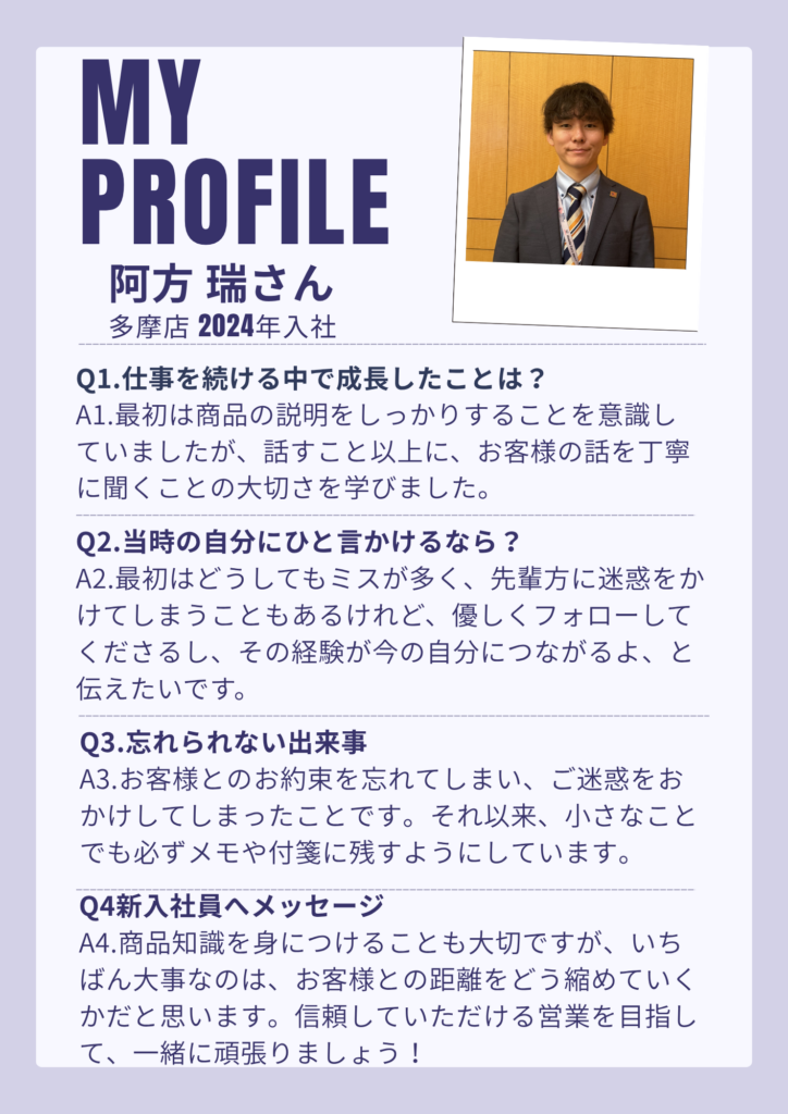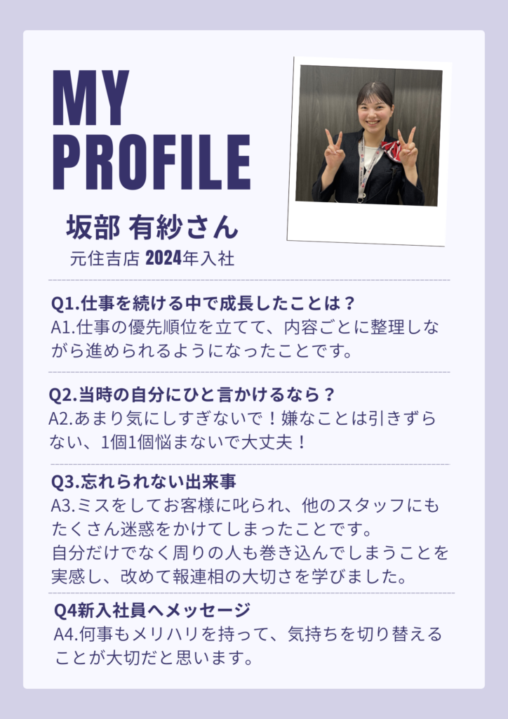 - ①不安もありますが、一つひとつ丁寧に仕事を覚え、少しでも早く皆さんの役に立てるよう頑張りたいです。